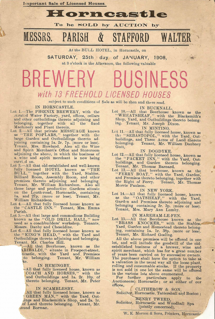In 1916 the business was merged with the California Brewery at Kirkstead to form the Horncastle & Kirkstead Brewery Company Ltd. The company traded fairly successfully until 1933 when it was advertised for auction at the Bull Hotel. Most of the pubs were bought by Batemans of Wainfleet, and Horncastle’s last brewery was closed down. The company was wound up in 1934.